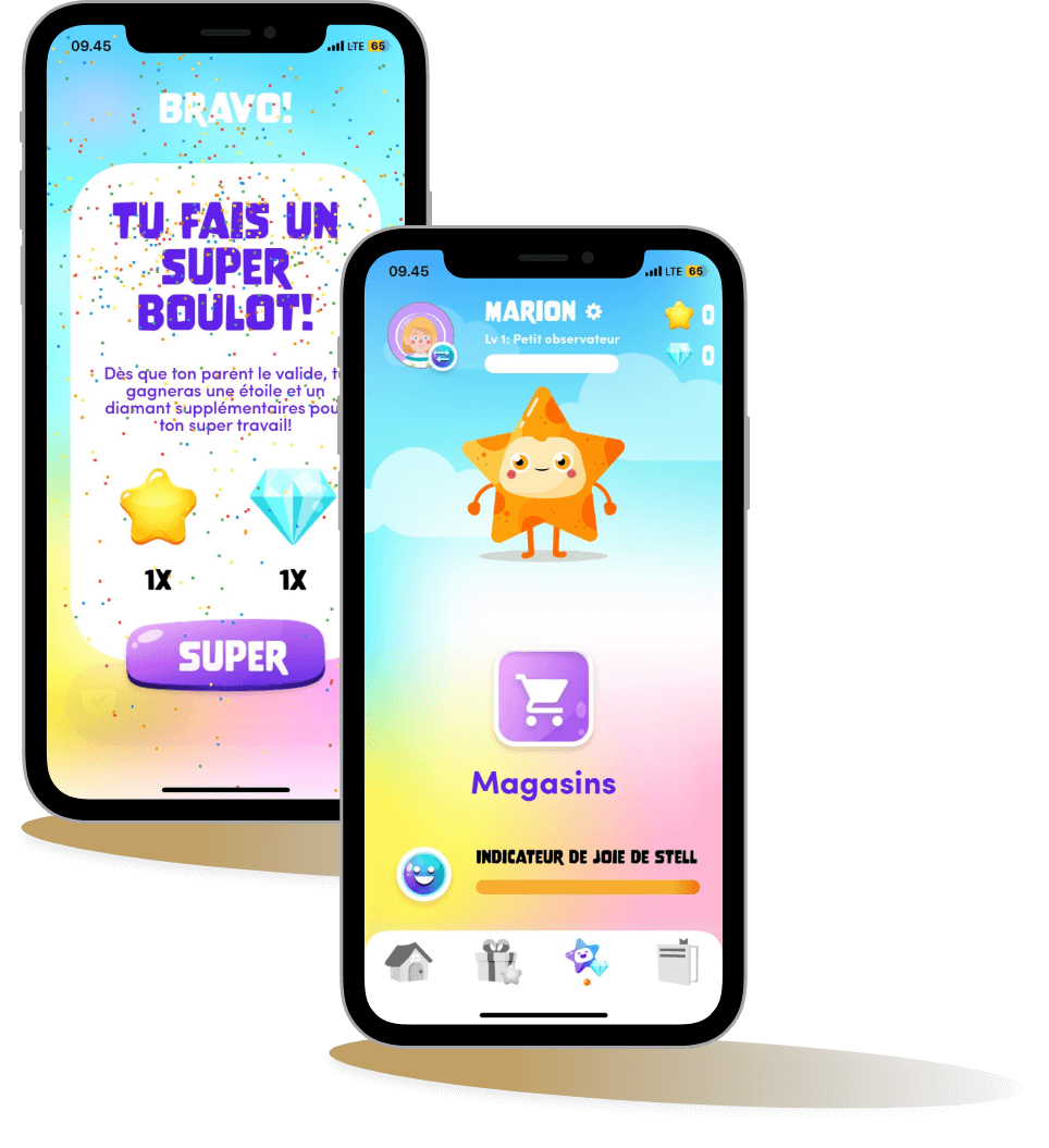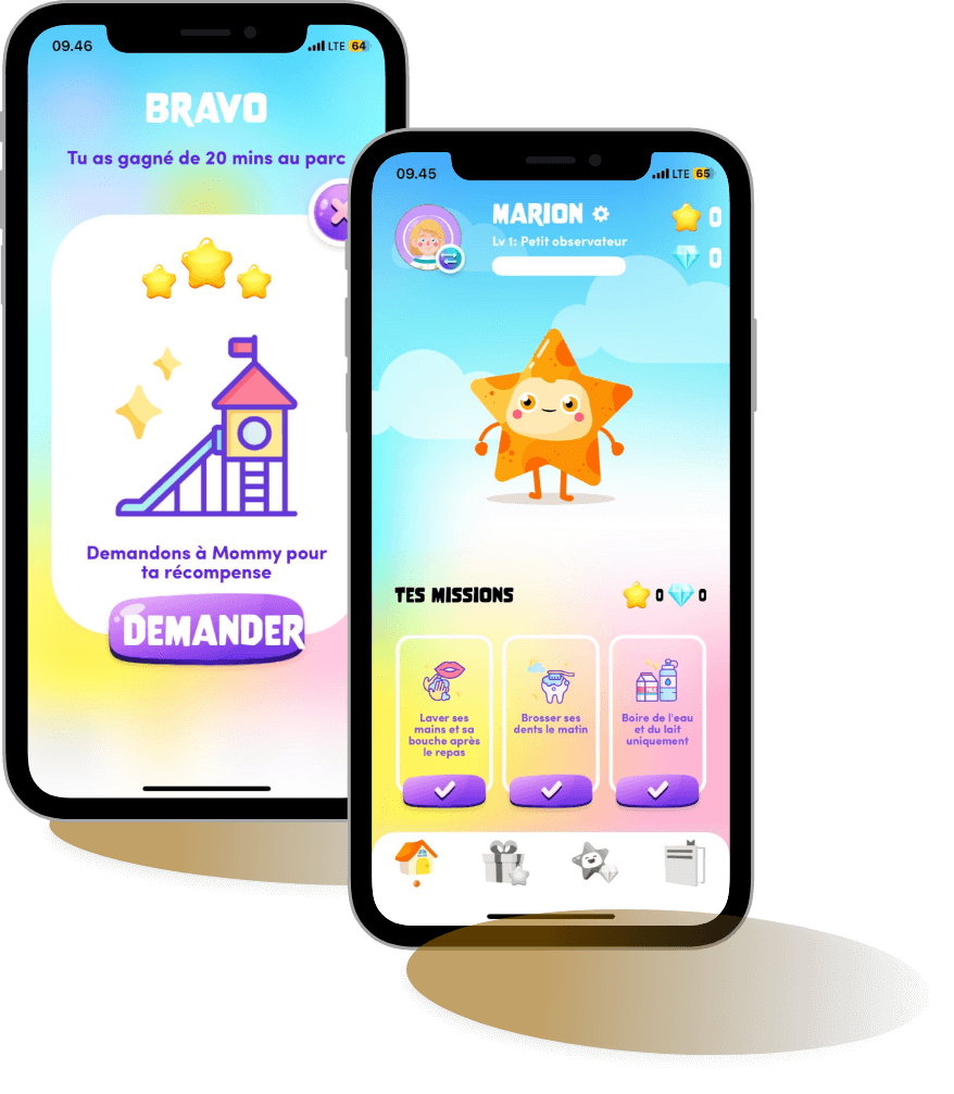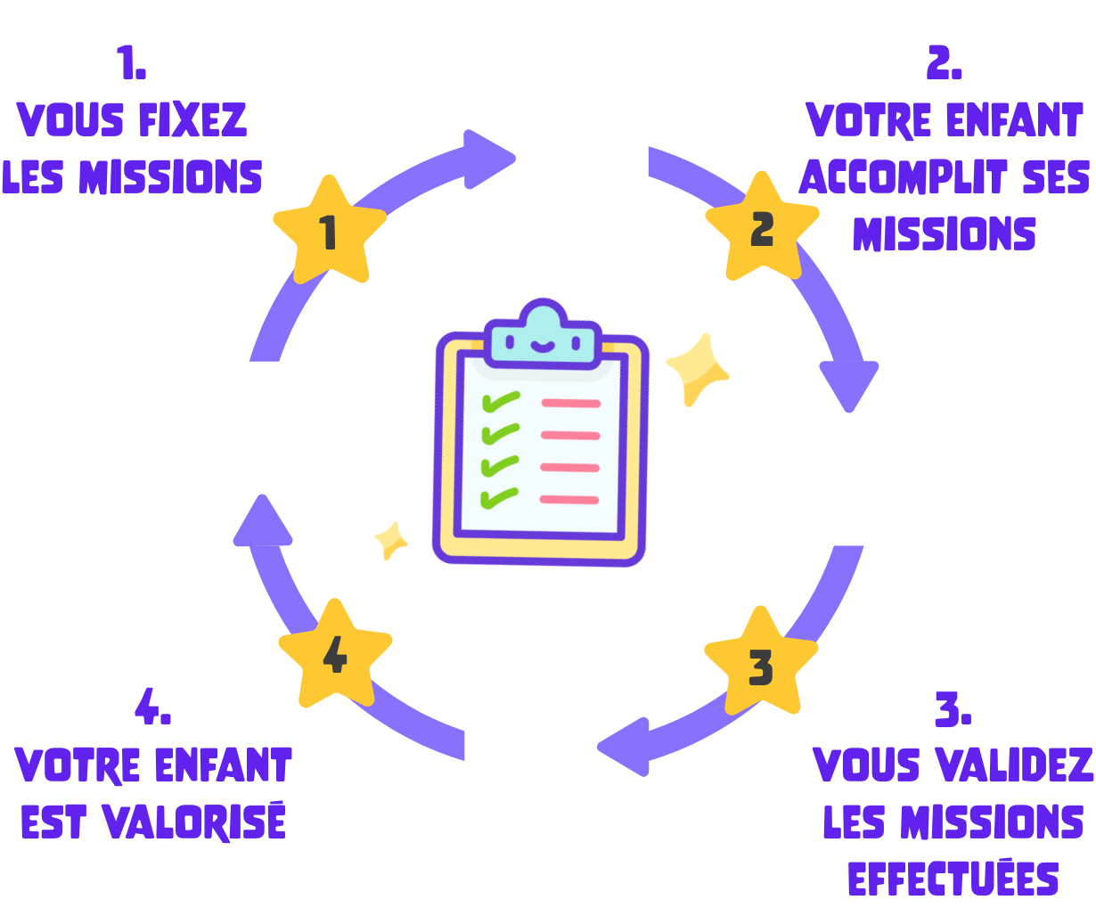 Une fois que votre enfant a accompli et validé sa mission avec l'approbation d'un parent, il reçoit une étoile et un diamant. Ces marques de succès lui permettent d'accéder à des privilèges choisis, encourageant ainsi ses efforts à court et moyen terme. Avec le temps, le développement de sa confiance en lui favorisera sa motivation intrinsèque, réduisant ainsi sa dépendance aux incitations externes.